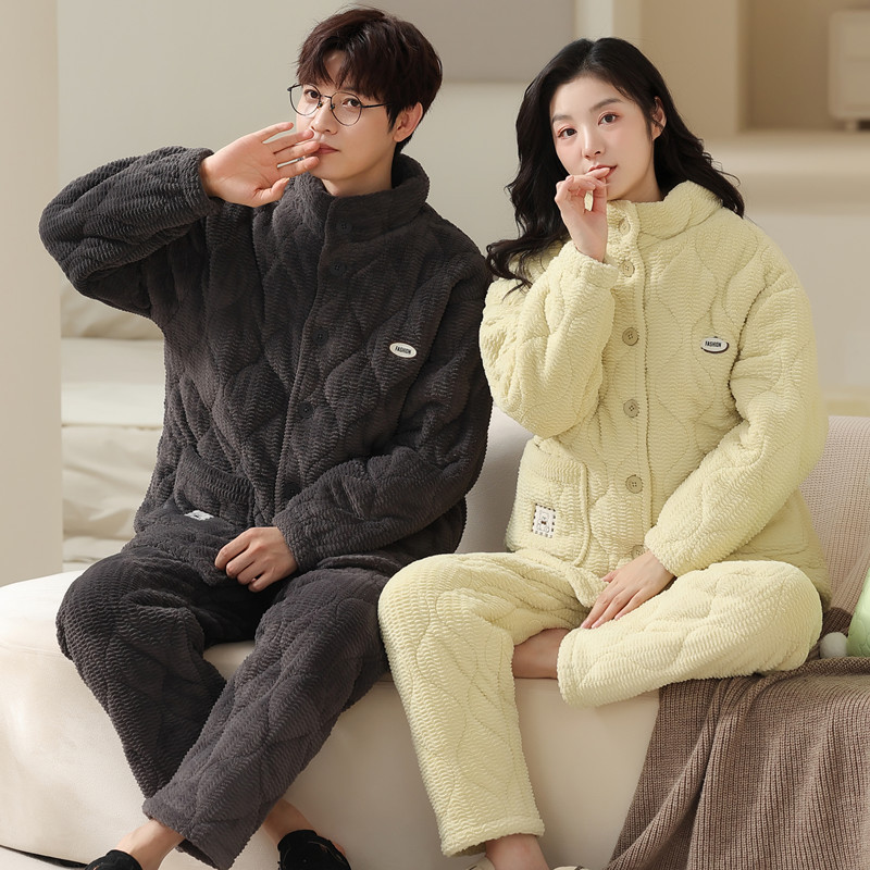 卸売りカップルのパジャマ秋冬コーラルベルベット綿長袖カーディガン襟付き快適保温ホームウェアセット