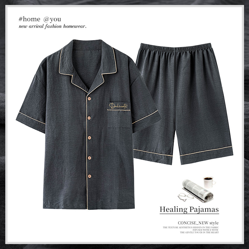 メンズパジャマ、サマーカウドコットン半袖ショーツ、カーディガン、ホームウェア、夏のメンズルーズスーツ