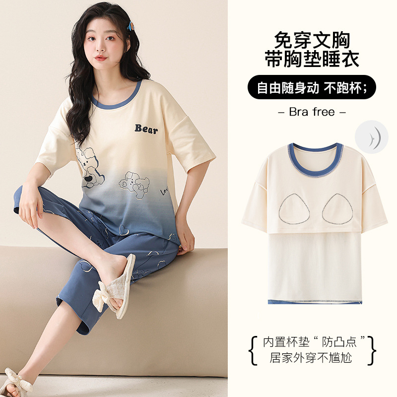 女性用パジャマ夏クラウドコットン胸パッド付き半袖ズボンスリーピーススーツ大きいサイズカーディガンカジュアルホームウェアアウターウェア
