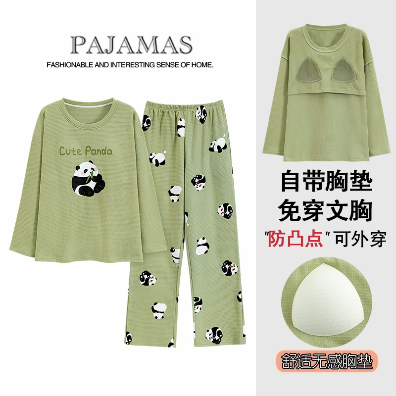 パジャマ女性春秋純綿長袖胸パッド付きかわいい漫画丸襟女性秋は家庭服セットを着ることができる