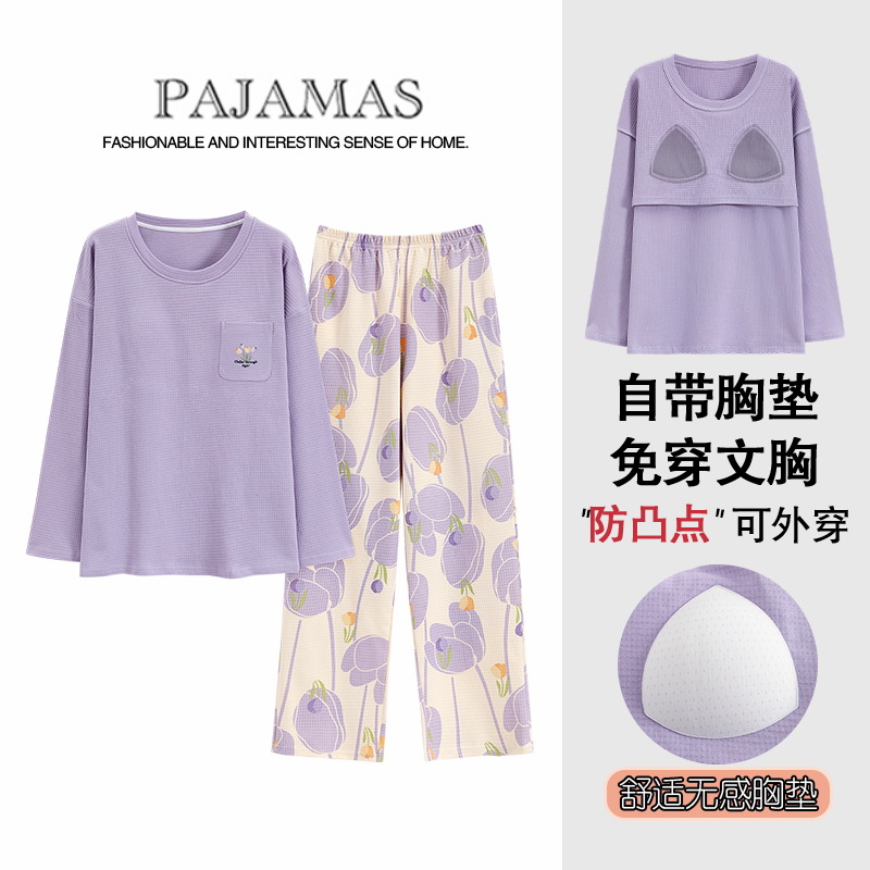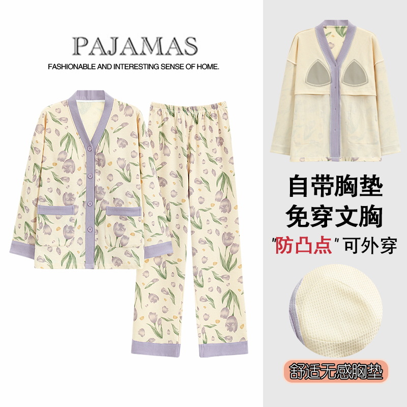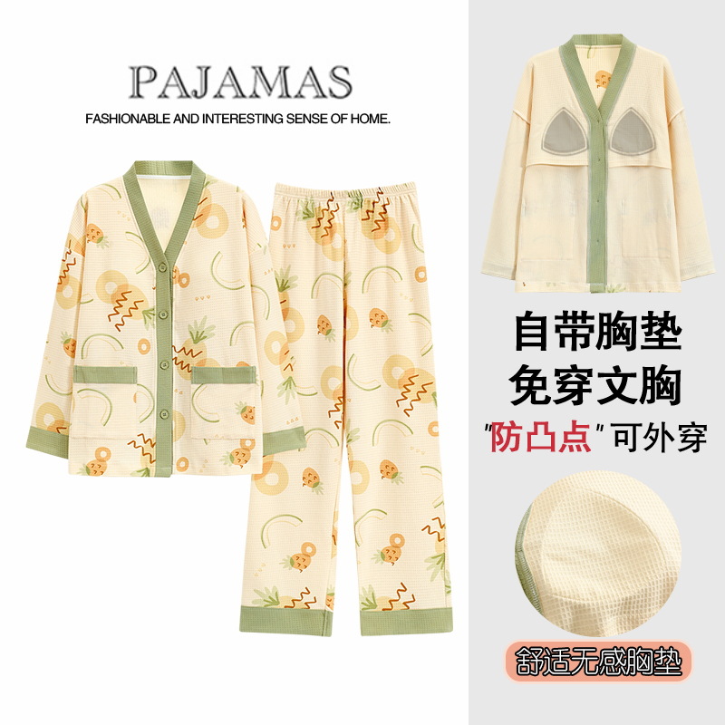 パジャマ女性春秋純綿胸パッド付き一体ワッフル秋の女性春夏の部屋着セット