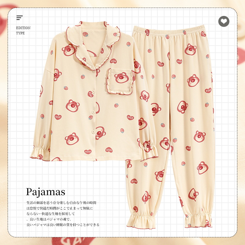 パジャマ女性春秋長袖綿質かわいい起爆いちご熊レジャーは秋の薄い家庭服セットを着ることができる