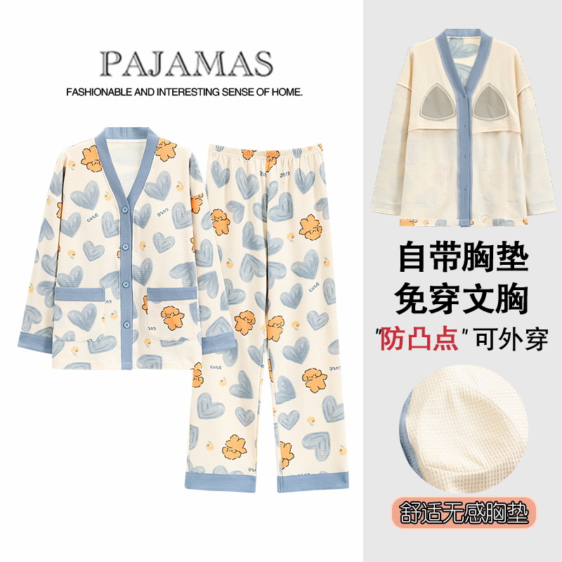 パジャマ女性春秋純綿長袖胸付カーディガンvネック甘い女性秋は家庭服セットを着ることができます。