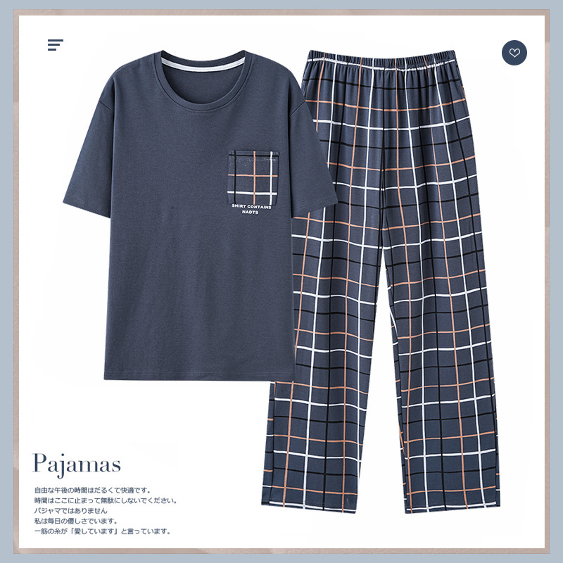 パジャマ男の夏の純綿半袖長ズボン夏の薄いタイプはカジュアルな純綿青年男性家庭服セットを着ることができます。
