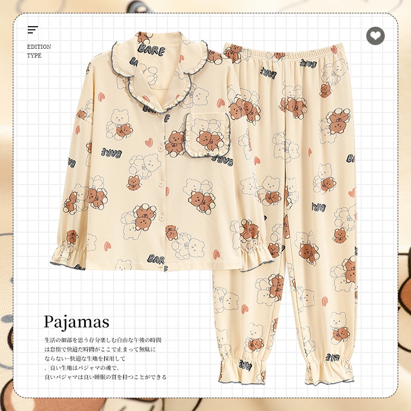 胸パッド付きパジャマ女性春と秋の純綿長袖の甘美で可愛い秋の女性は家庭服セットを着て卸売りできます。