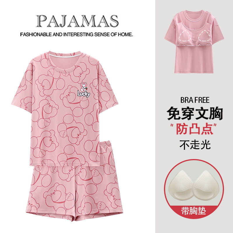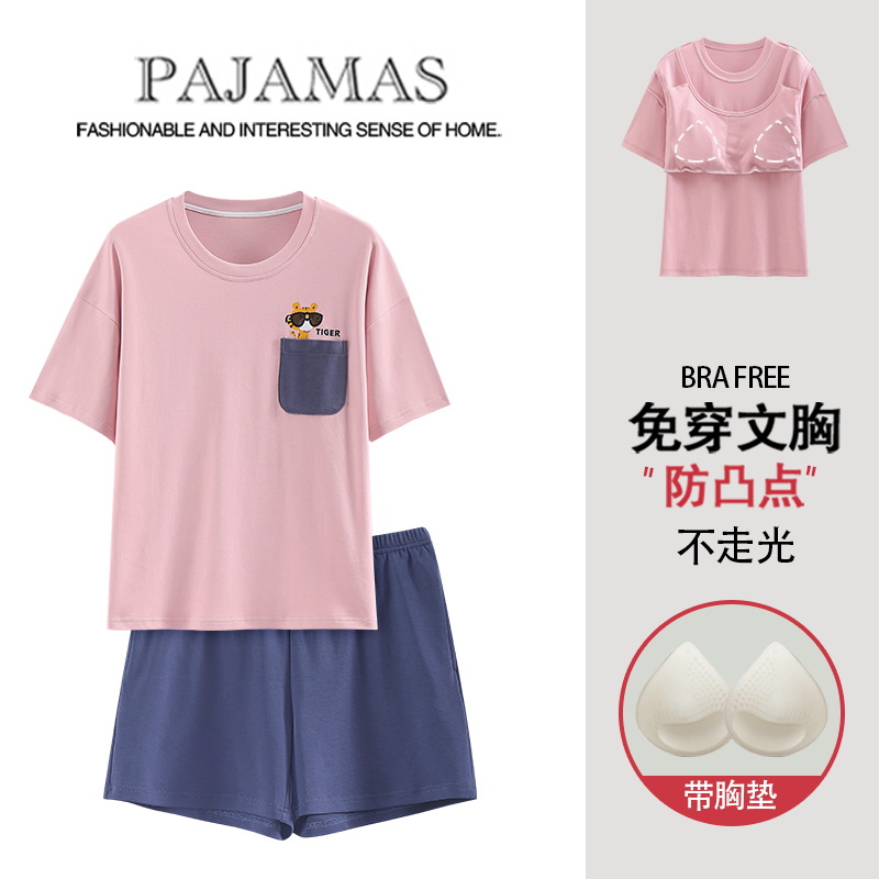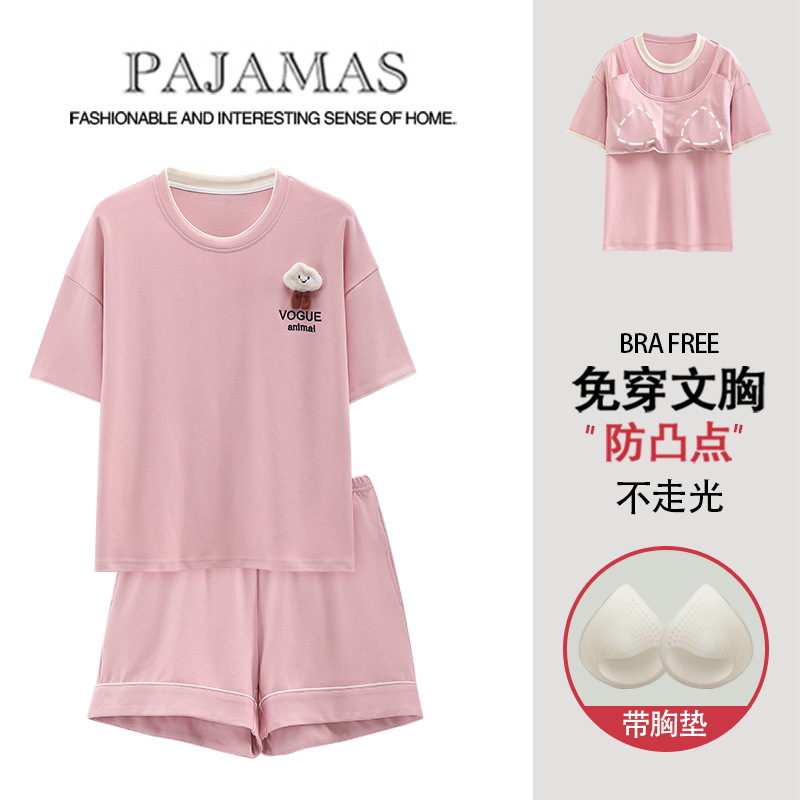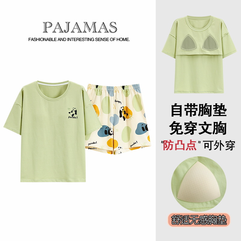 卸売りパジャマ女性夏綿綿は胸パッド一体女性カジュアルかわいい夏半袖ホームウェアセットを持っている