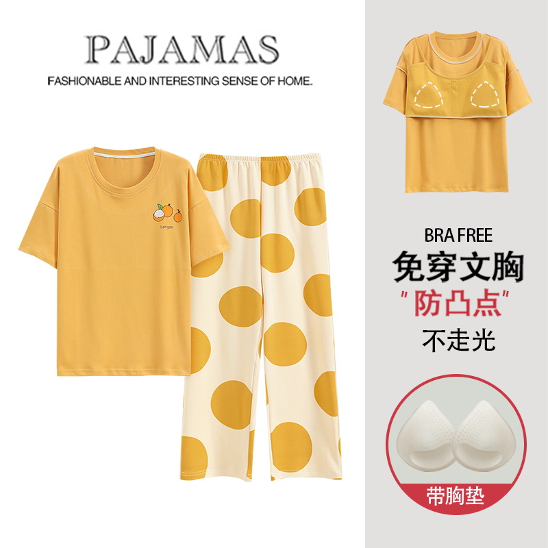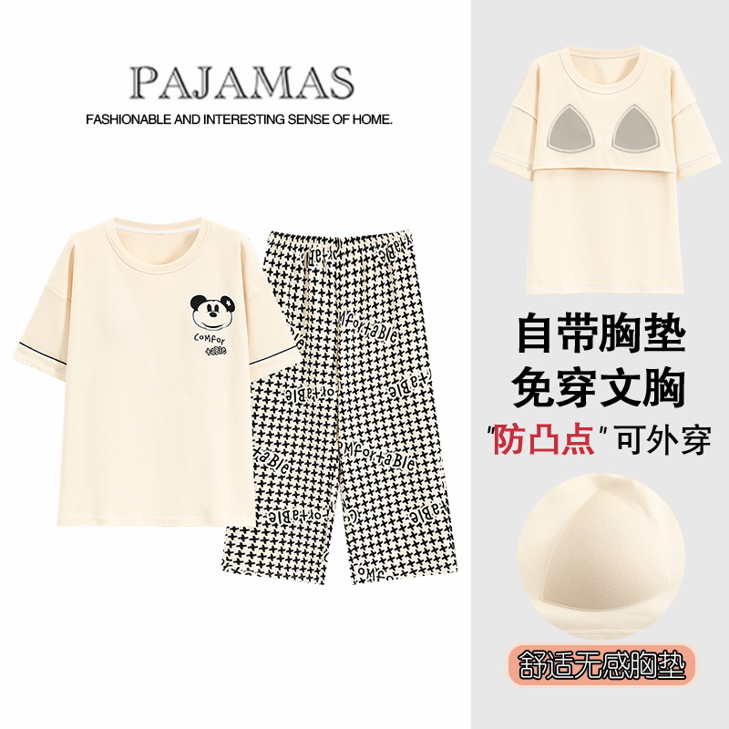半袖パジャマ女性夏綿胸パッド付き七分ズボン2024年新夏はホームウェアを着ることができる