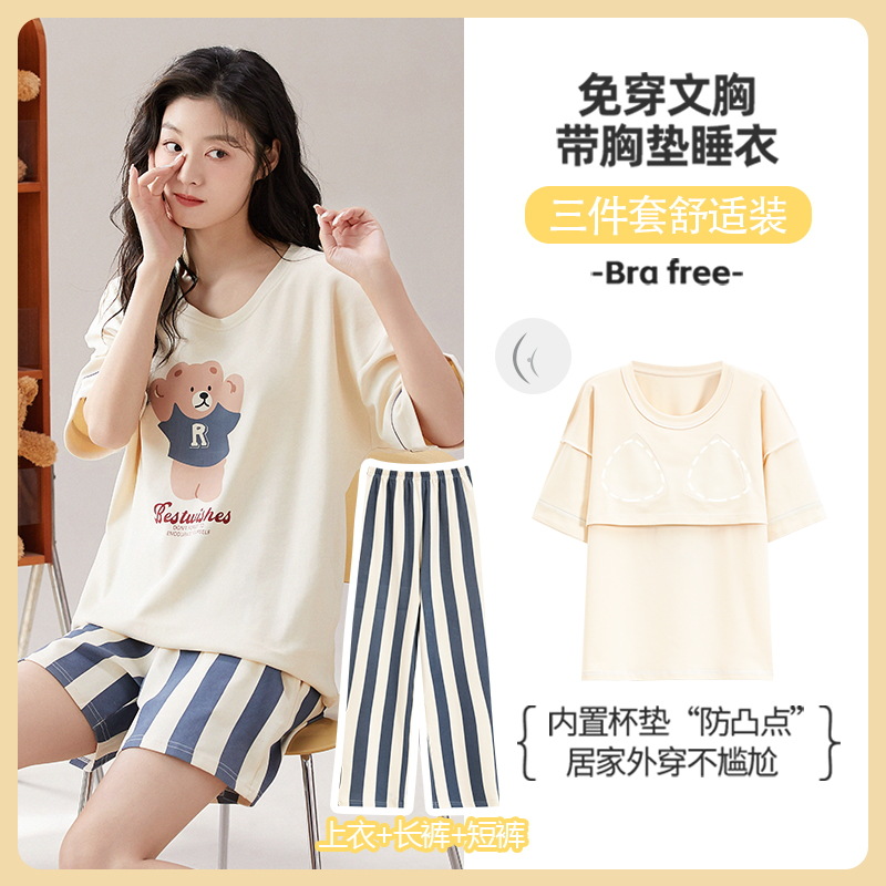 パジャマ三点セット女性夏綿胸パッド付き薄い半袖ズボン夏カジュアルかわいい女性ホームウェア