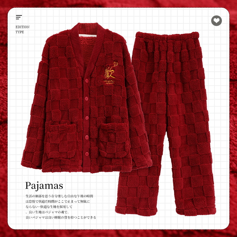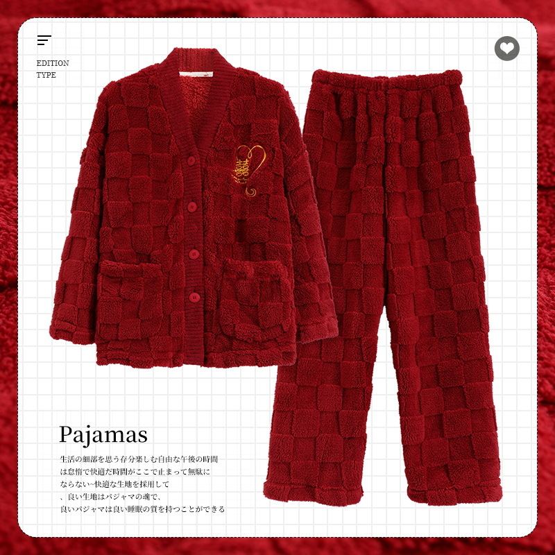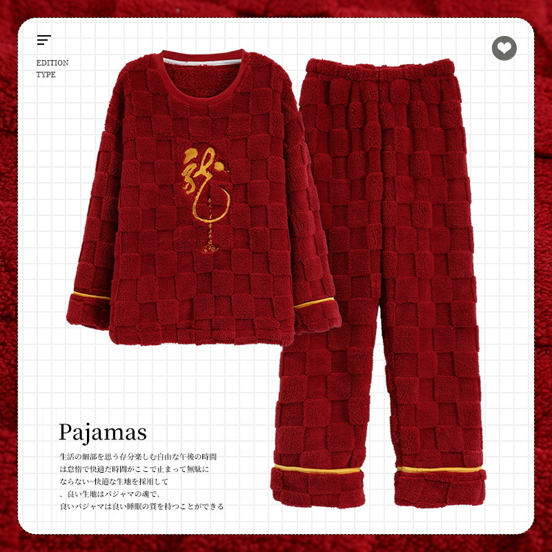 カップルのパジャマ冬のサンゴのベルベットの赤い新婚結婚セット秋冬の日にベルベットを入れて男女の家庭服を厚くする