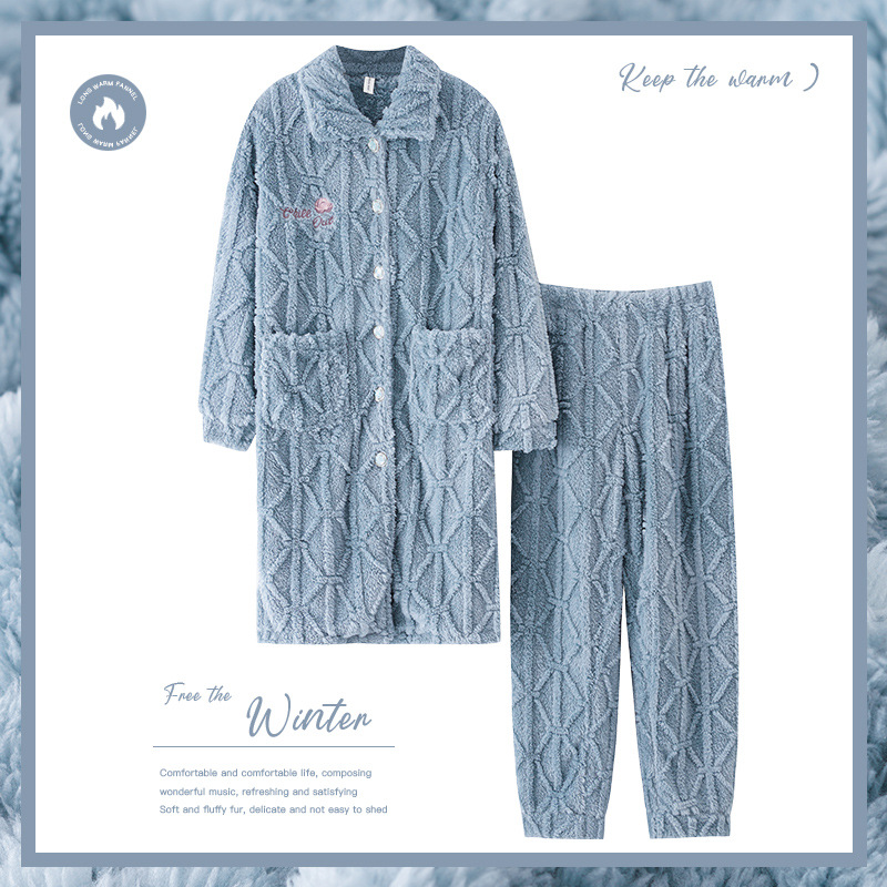 サンゴのベルベットのパジャマの女性は秋冬にベルベットを厚くして、中長のパジャマの冬の女性フランネルの保温バスローブのセットを厚くします