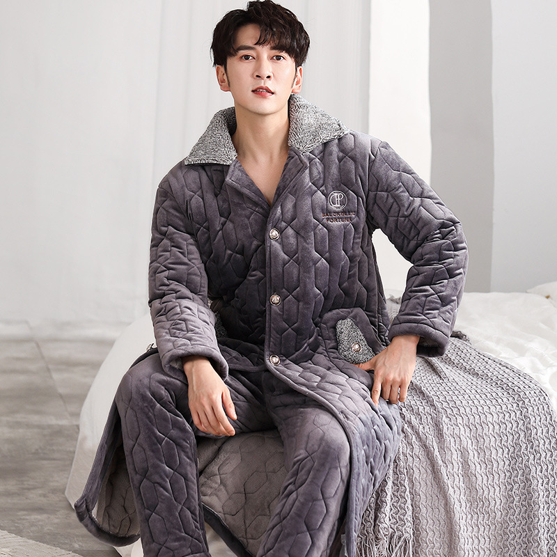 パジャマの男性は冬に厚いベルベットの三層綿のパジャマセット中年のお父さんの保温サンゴのベルベットの家の服を着ています