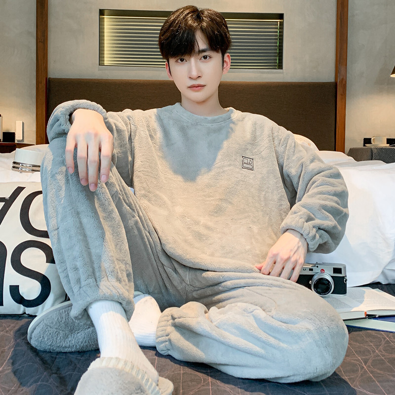 2024新型コーラルベルベットのパジャマ男性秋冬のベルベットは冬の青少年男性の家庭服セットを厚くした
