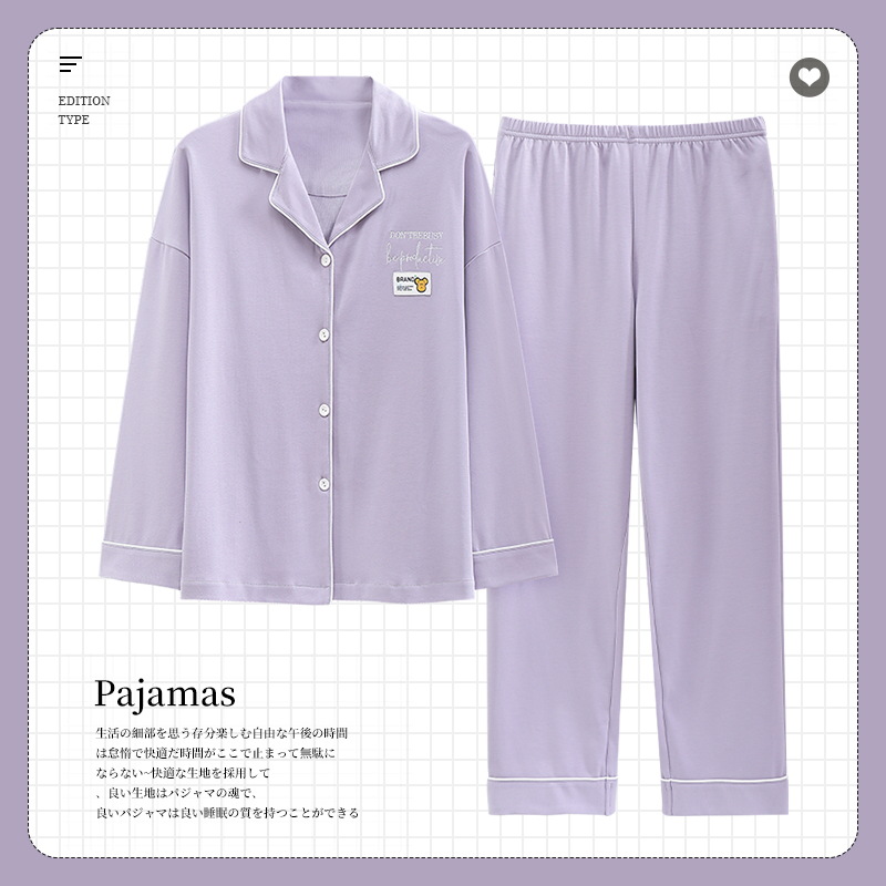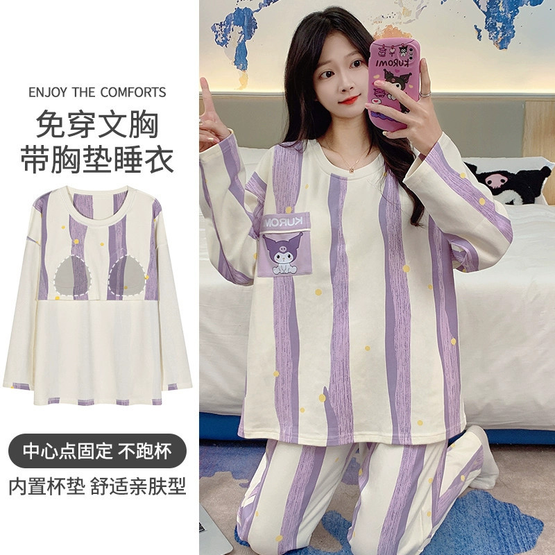 新しいパジャマの女性は春と秋には、胸パッド付きの綿の長袖セットを着ることができます。