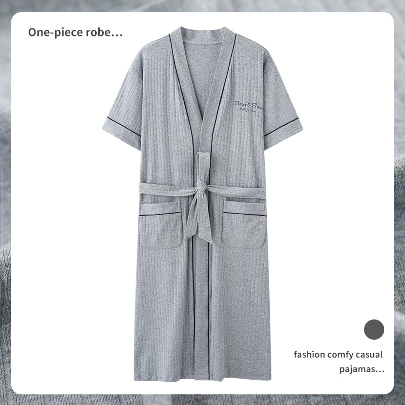 純綿の寝衣の男性春と秋の長袖のゆったりした大きいサイズのバスローブの中の長いタイプの薄いタイプの綿は家の服を着ることができます。