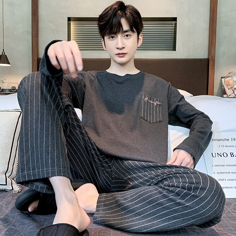 パジャマ男性春秋純綿長袖ストライプカジュアル新商品青少年男性ビッグサイズ家庭服セット卸売り