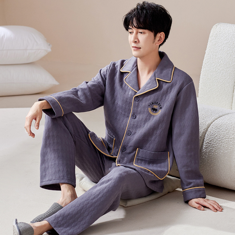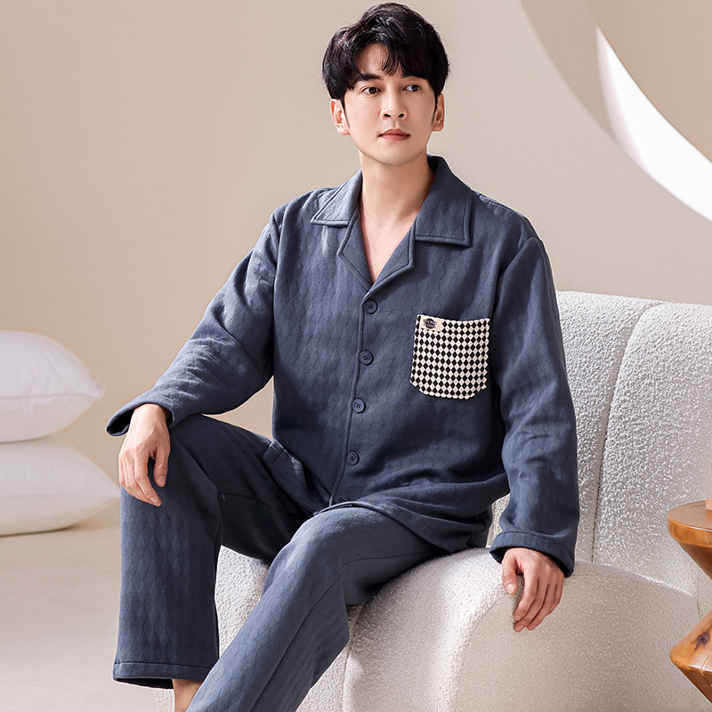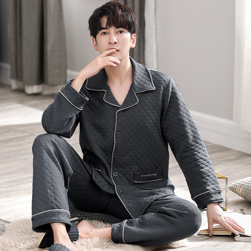 男性のパジャマ男性の冬のパジャマの長袖は純綿の空気綿の薄い綿のサンドイッチの春と秋の冬の保温の浴衣を厚くします。