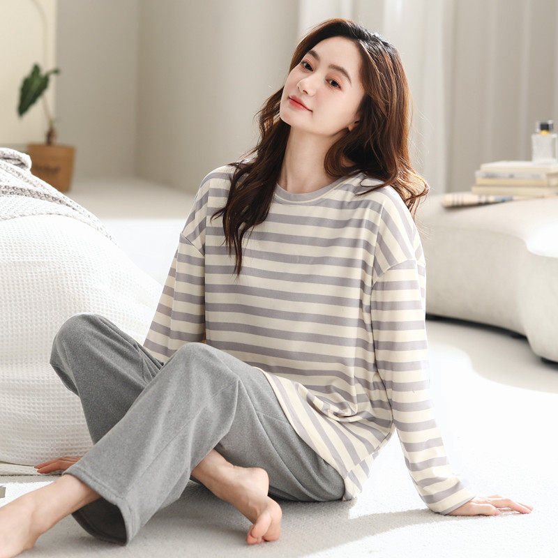 卸売りの徳絨毛のパジャマの女性の春と秋の長袖のカジュアルなストライプは外に着て外に出かけることができます。