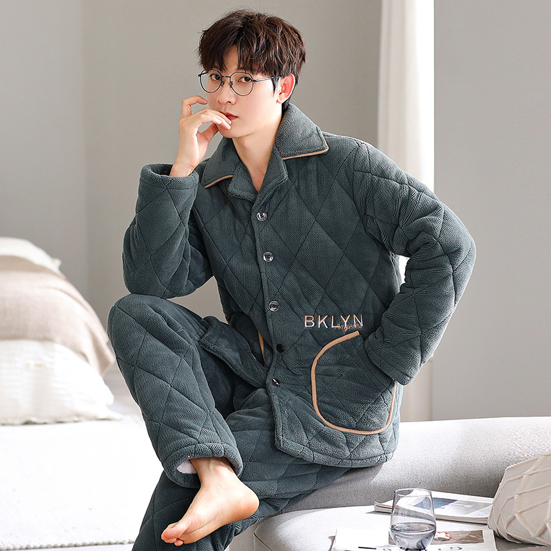パジャマ男性冬三層厚手コットンコーラルフランネル家庭服セット新型冬保温綿入れ
