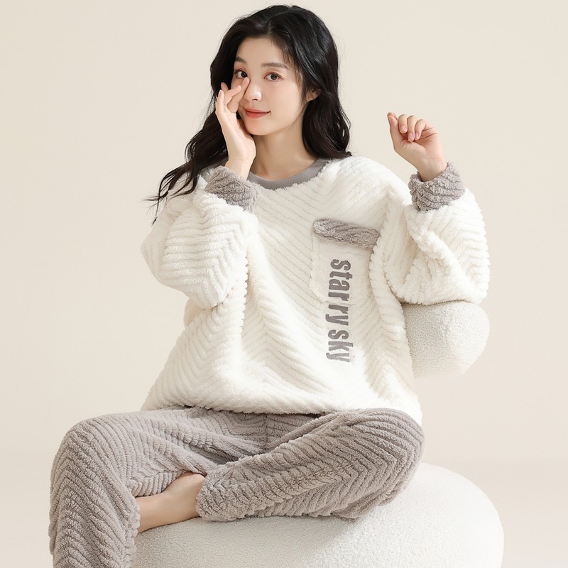 パジャマ女性の秋冬のサンゴのベルベットは保温冬のレジャーを厚くしてフランネルの家庭服セットを着ることができる