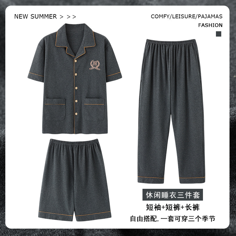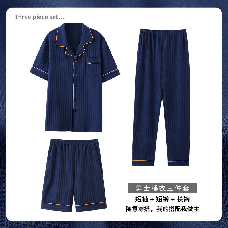 男性パジャマ男性夏純綿半袖カーディガン3点セット中年のお父さんの大きいサイズは家の服を着ることができます。