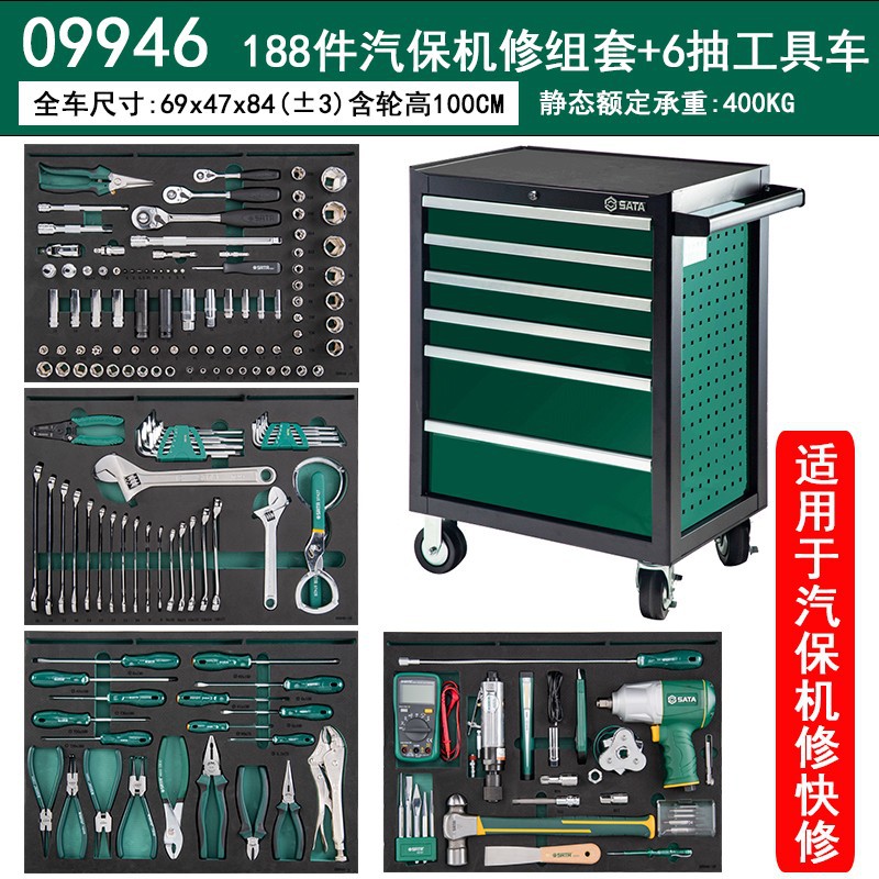 世達09946自動車保険188件の快速修理工具セットには、六引き出し27インチの工具車と工具が含まれています