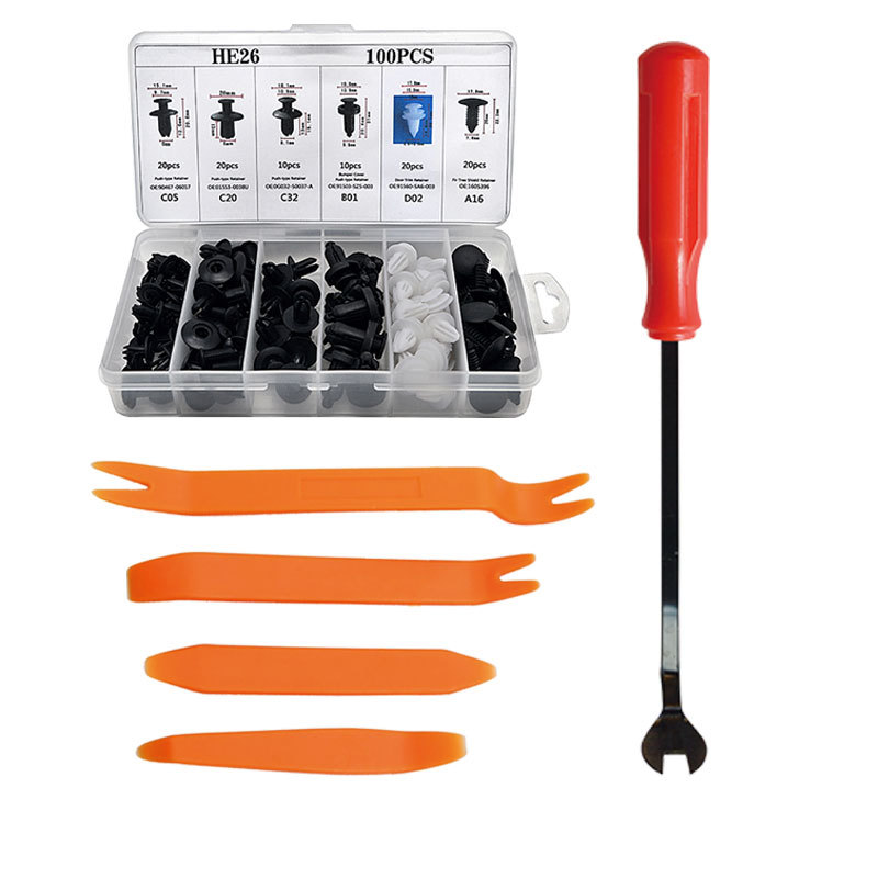 100pcs箱入りバックル6種類の自動車プラスチック固定バックル汎用自動車部品バックルhe26