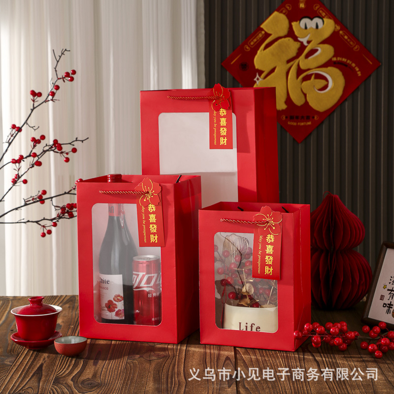 2026年新年提提袋中国風ギフトバッグ赤い透明紙袋ギフトバッグ赤いお祝い包装袋