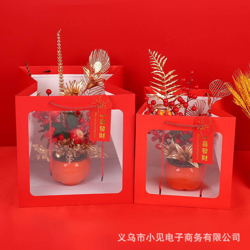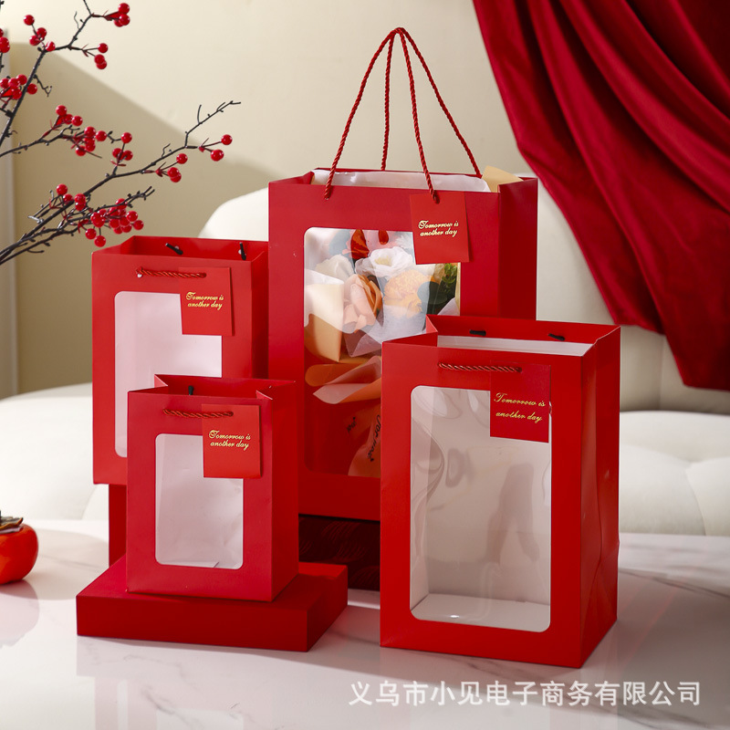 中国の赤い手提げ袋、祝賀物袋、お祝いの結婚祝いギフトバッグ、透明窓付きギフトバッグ