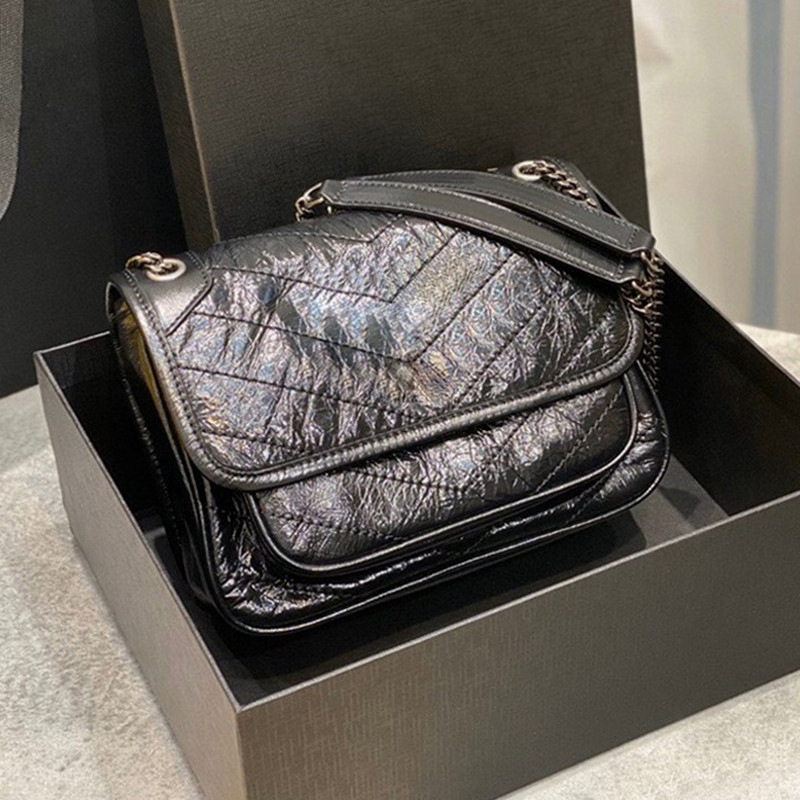 新しい放浪バッグの元牛革の女性バッグの肩ベルトが色のチェーンバッグにぶつかっています。