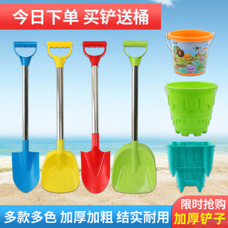 子供のシャベルは砂を遊んで砂を掘って砂浜のおもちゃを掘って海辺に砂を掘って道具を掘ってバケツをすくってセットして雪をすくって雪だるまを作ります。