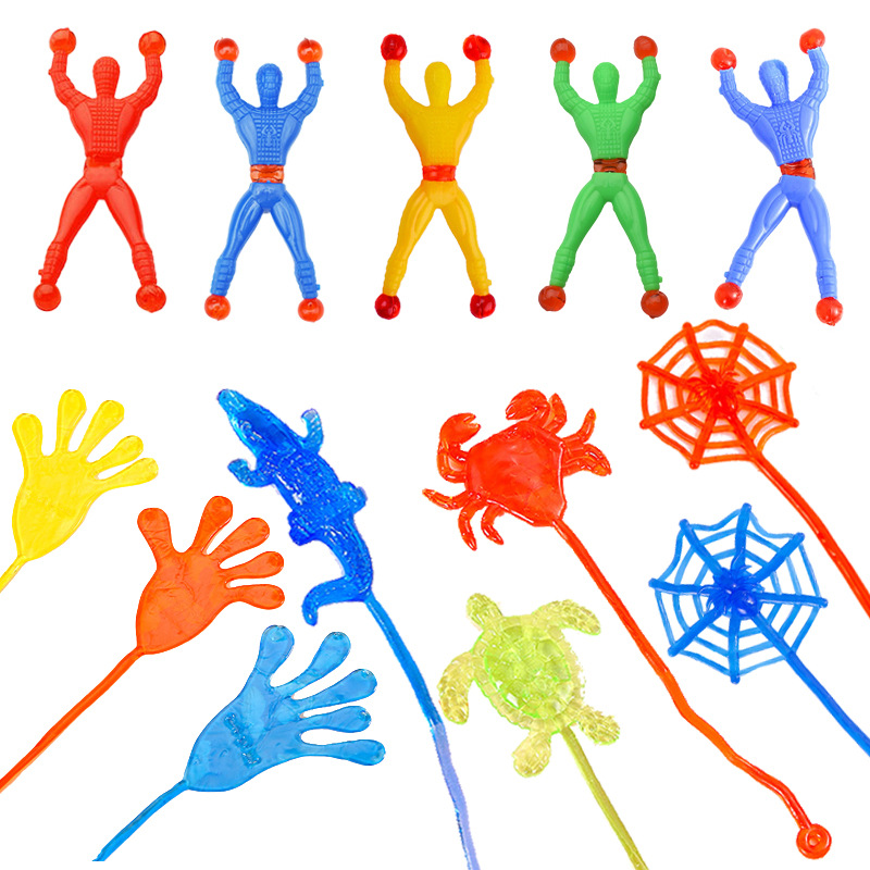 壁に登るクモの人のおもちゃの子供の解凍は手のひらのアイデアにくっつきます。