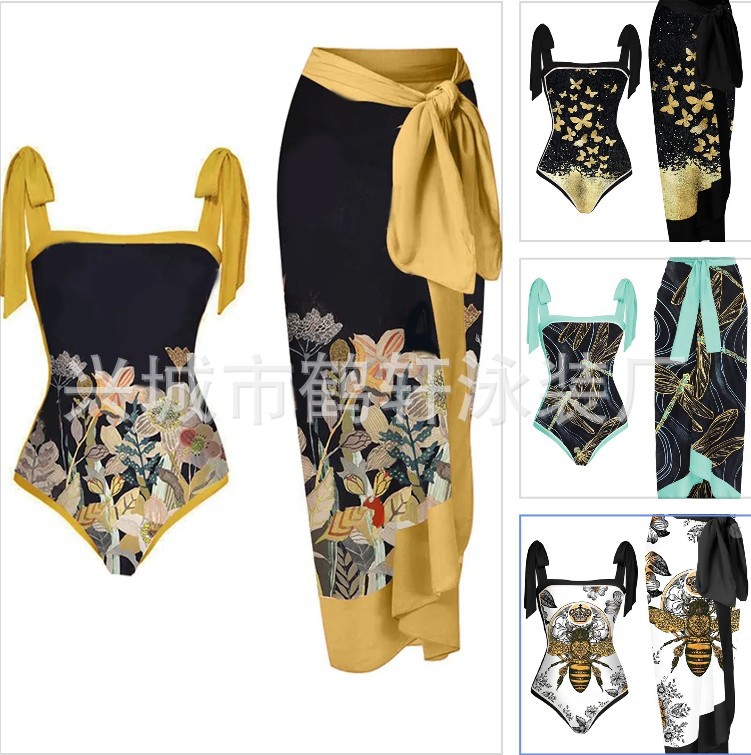 2024新型アマゾン欧米越境ファッションプリント保守分体肩ベルトスカート式ビキニ水着女性
