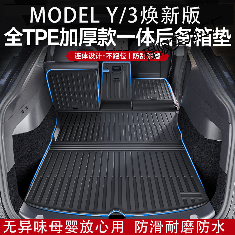 テスラ熙新model 3y版TPEトランクマットを適用して、背もたれマットの後ろのトランクマットを完全に囲んでいます。