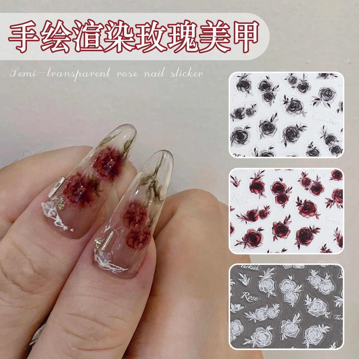 ネイルシールゴシック風手描きバラ花レリーフ立体白黒半透ヘモグロビンバラ花爪貼り