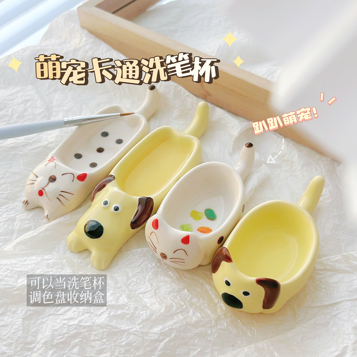 ネイルツール萌えかわいいアニメ腹ばい犬の短い足の猫が筆を洗う皿の創造的な陶磁器の筆を洗うコップのパレット