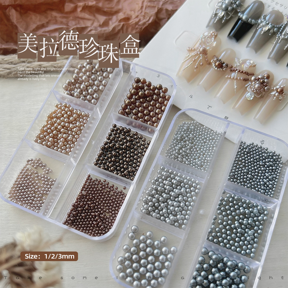 メラトネイルハイライト真珠アクセサリーサイズミックス六格箱付き立体カレー色グレーブルーノンホールパール