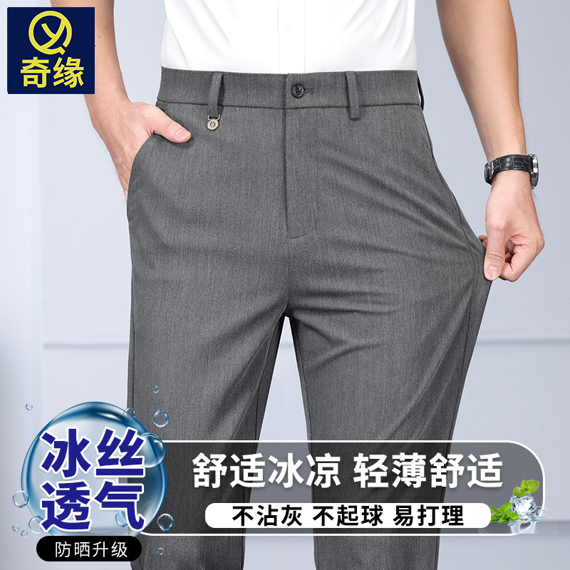 薄い弾力性ビジネスカジュアルパンツ男性2025夏の新型高腰ストレートズボン氷糸無熱男性ズボン