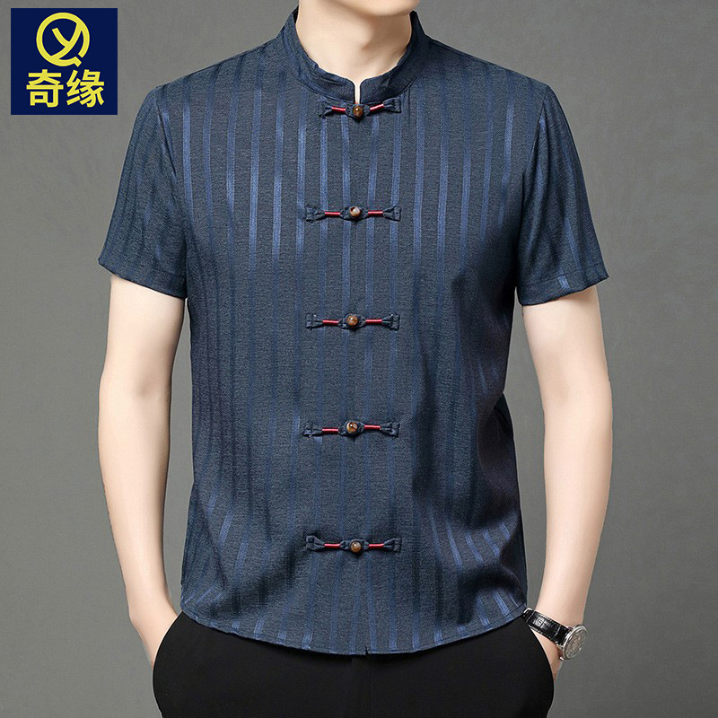 亜麻シルク半袖シャツ男性高級感2025夏の新型中国式バックルストライプ男性シャツ卸売り