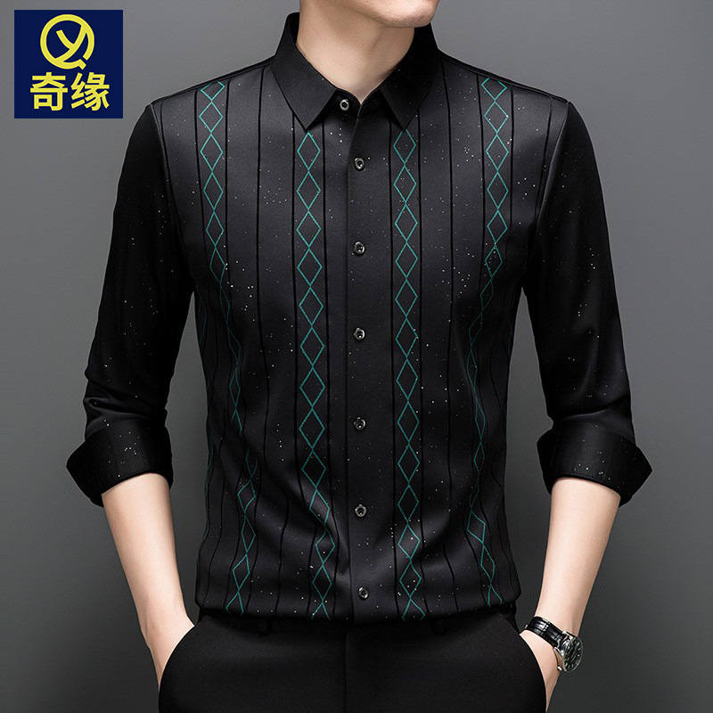高級感無痕男性シャツ2025春の新型中年ビジネスカジュアルプリント弾力シャツ男性卸売り