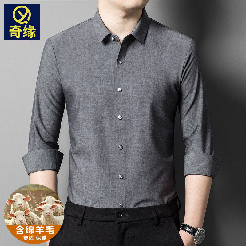 クロスボーダー高品質ウールシャツ男性2025春秋新作ビジネスカジュアル純色無熱襟シャツ男性モデル