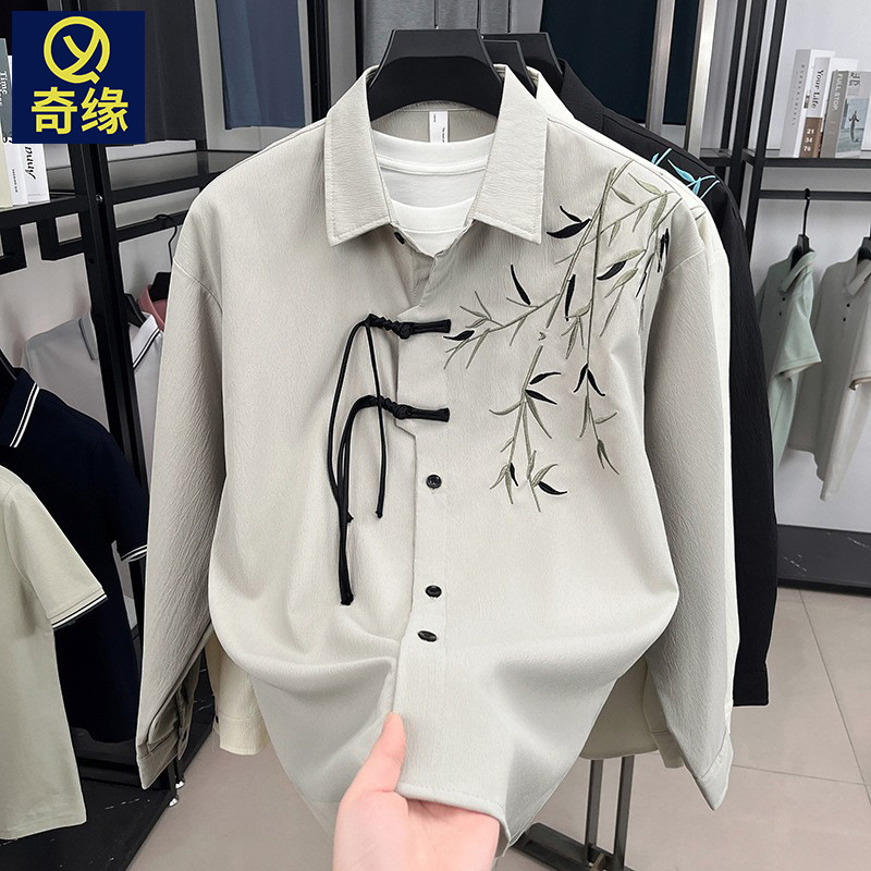 2025春秋新型中国風長袖シャツ男性ファッションファッションファッション青年刺繍国潮男性シャツ卸売り