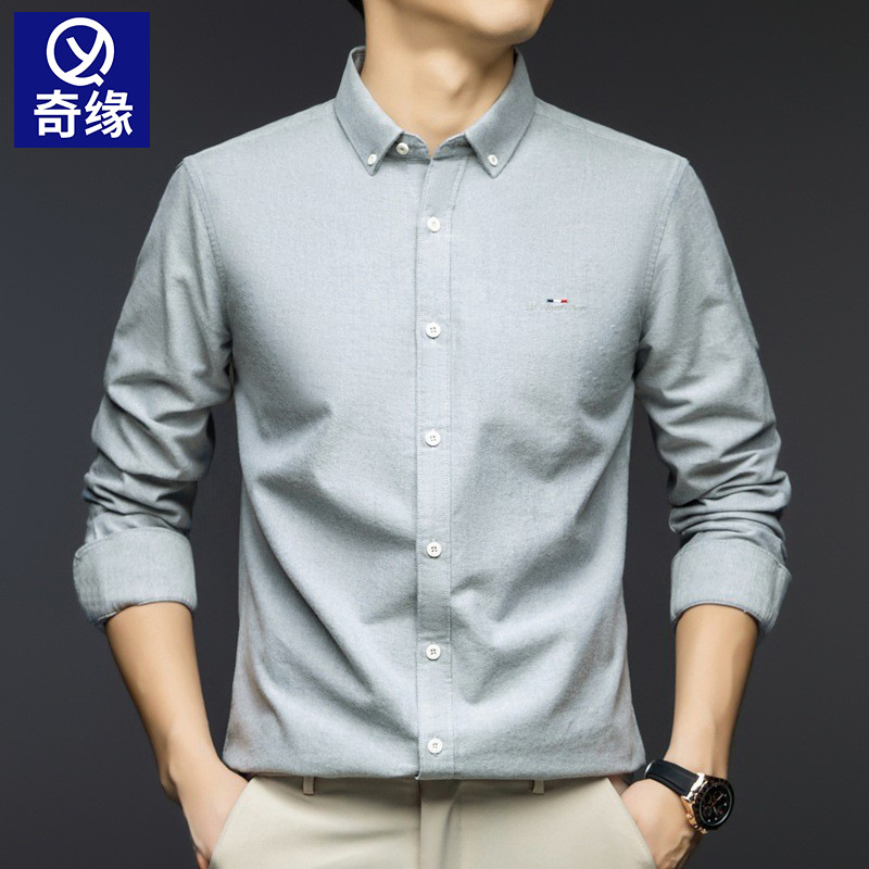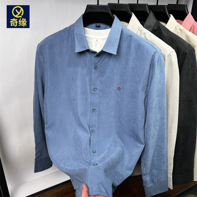 2025春秋新作刺繍スエードシャツ男性長袖中年ビジネスカジュアル純色メンズシャツ