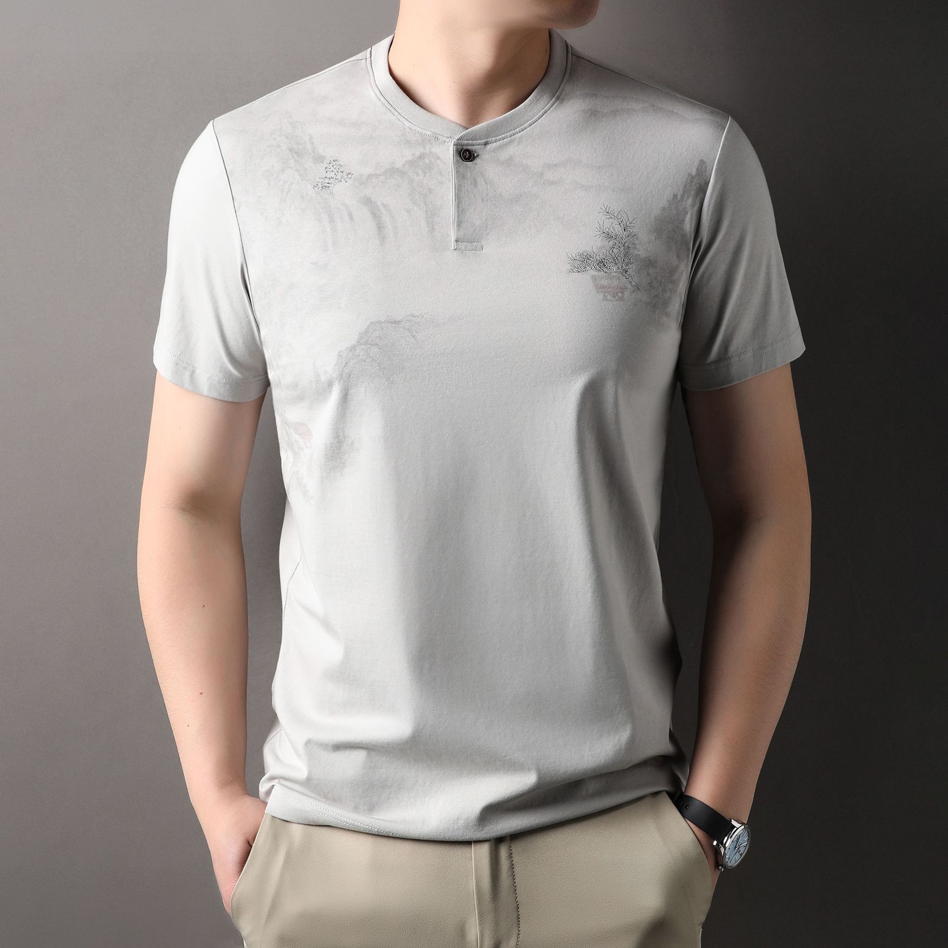 2025夏の新型シルク綿半袖tシャツ男性ファッションカジュアル中国風綿麻立襟男性半袖