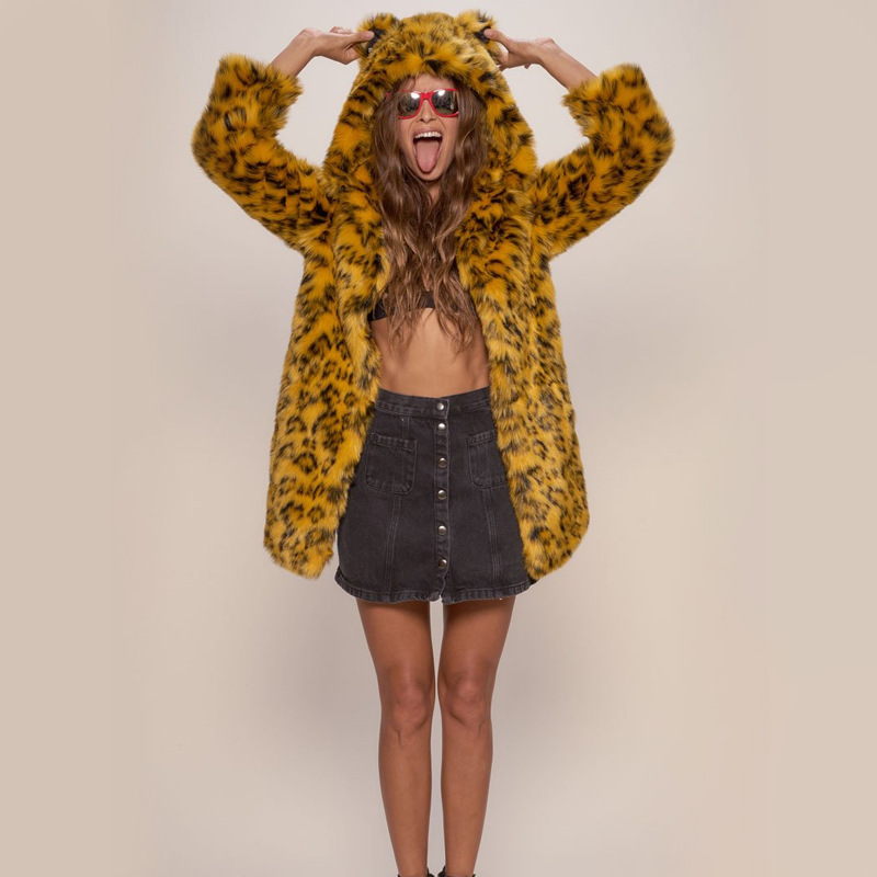 2021黄色のヒョウ柄のコートは毛皮のコートのようです。