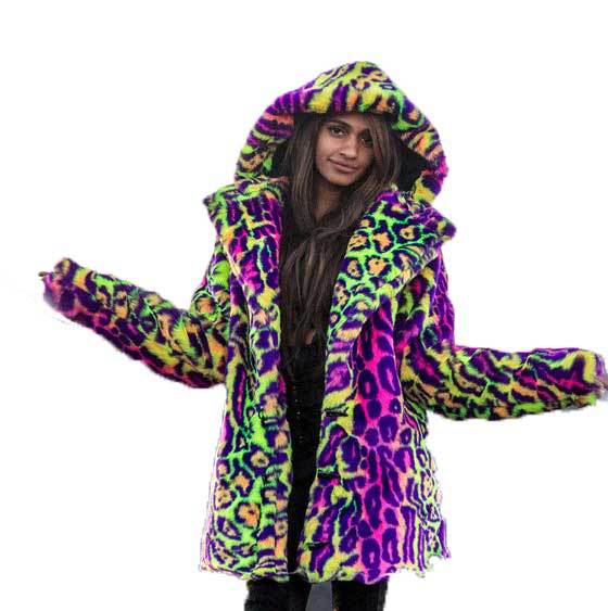 アマゾンの爆発的な毛皮の女性の毛羽のコートは帽子の秋冬の中で長い外国貿易のネオンのヒョウの紋様の毛皮のコートをつないでいます。