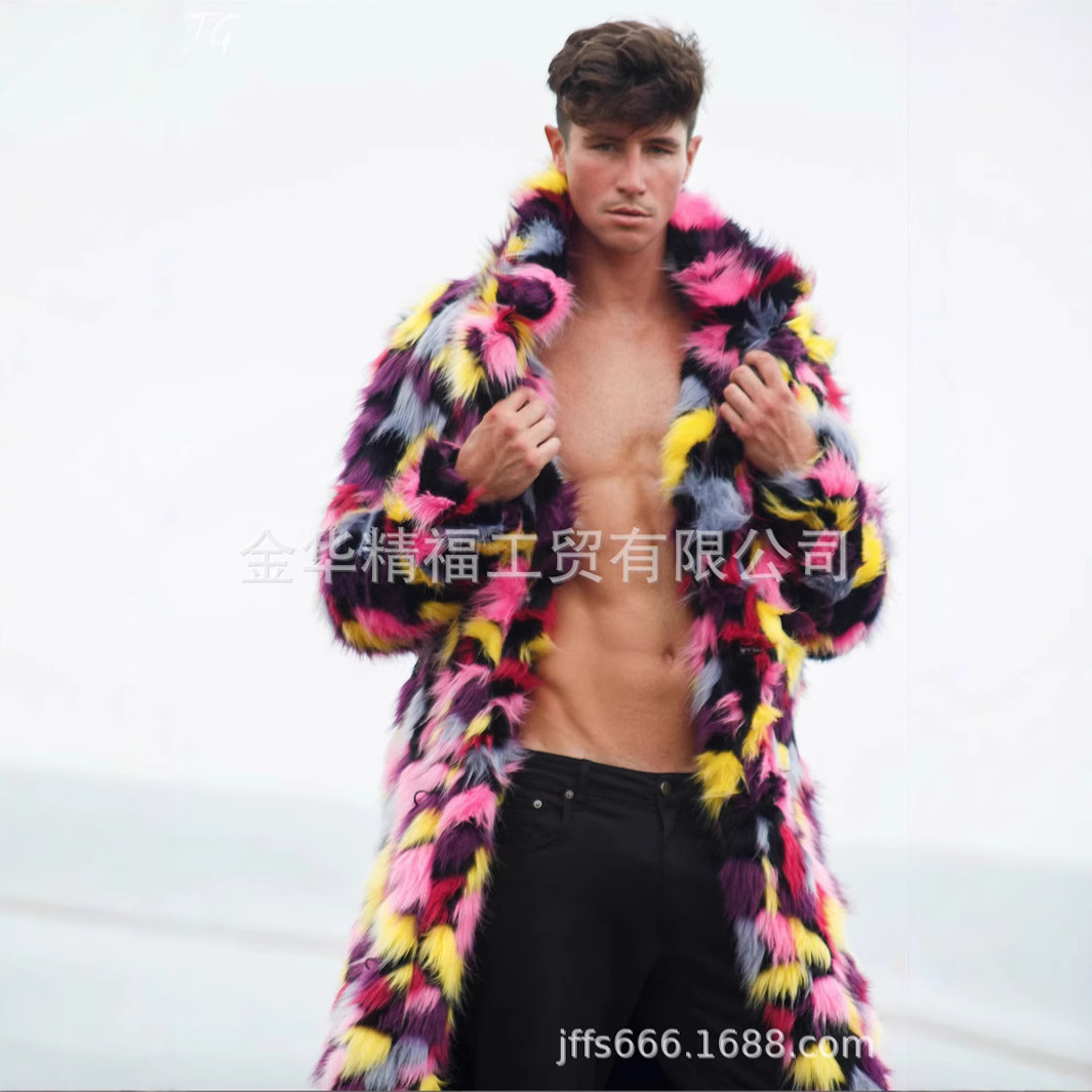 欧米風フェイクファーコート、トレンディな個性派メンズロングコート、カラフルで環境に優しいフェイクファー、フォックスファーコート