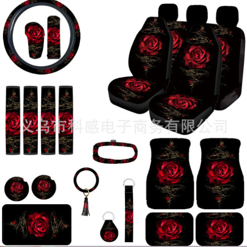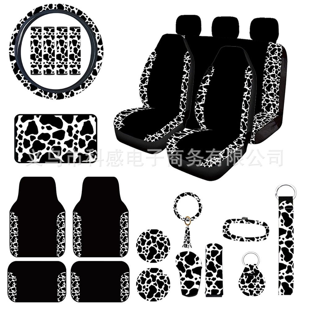 クロスボーダー黒豹紋17点セットの自動車シートカバーのハンドルカバーのアームレストの肩カバーのキーホルダー