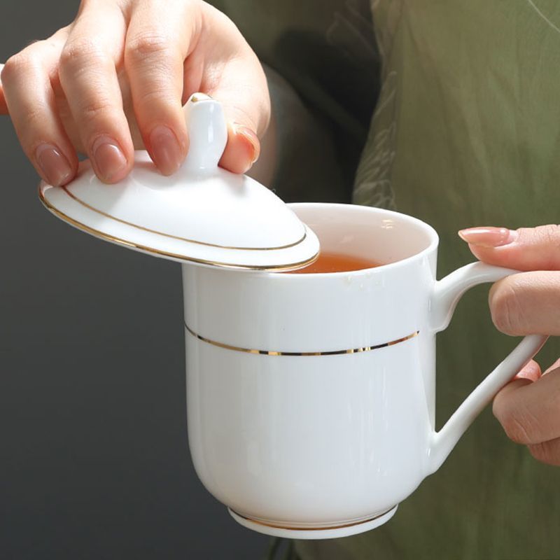 会议室带盖茶杯陶瓷酒店宾馆白色喝水杯金边办公室水杯钉制