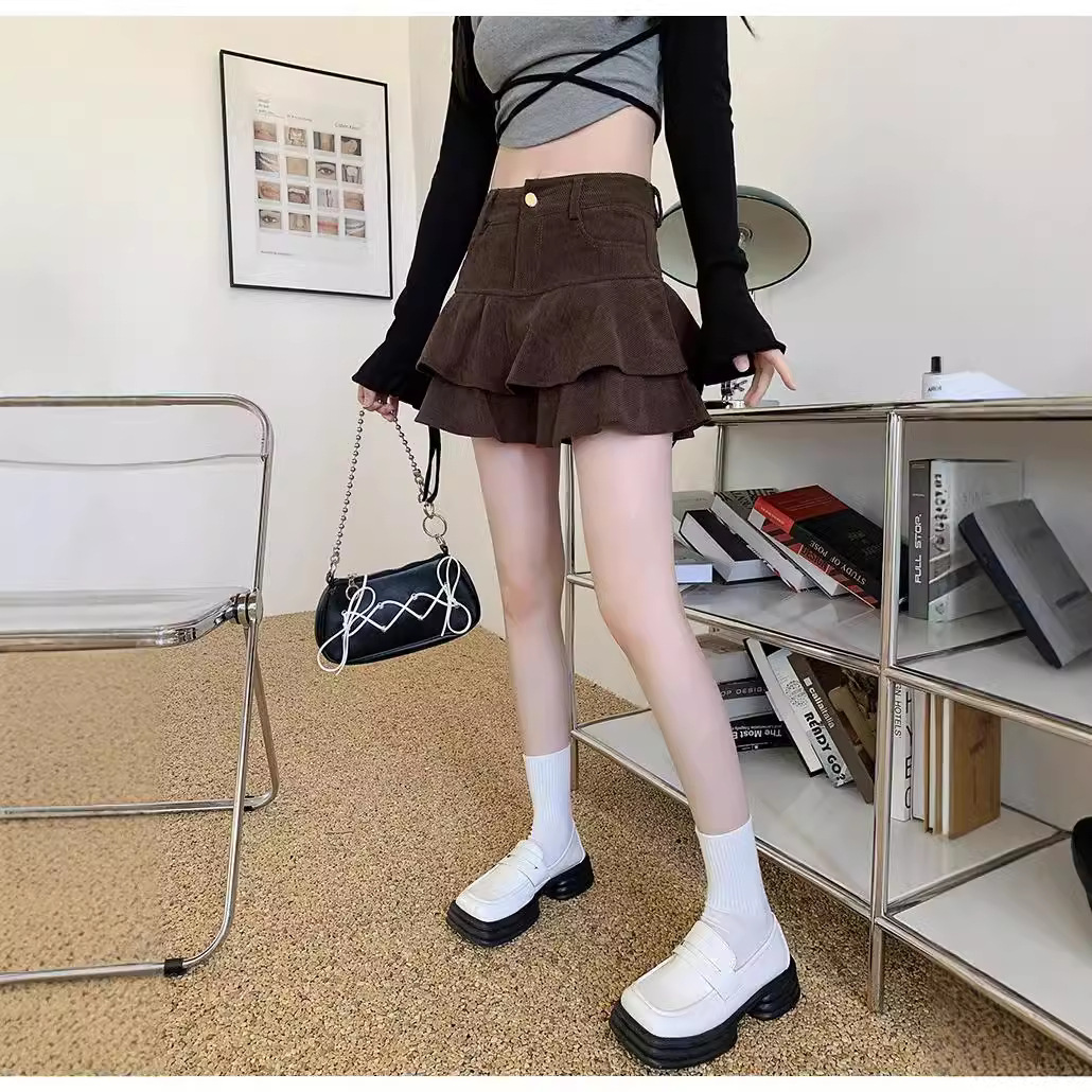 魚の尾のスカートの半身のスカートの女性の2024の新型の秋冬の高い腰の小さい背の二重のa字の蓬蓬のコーデュロイの短いスカート