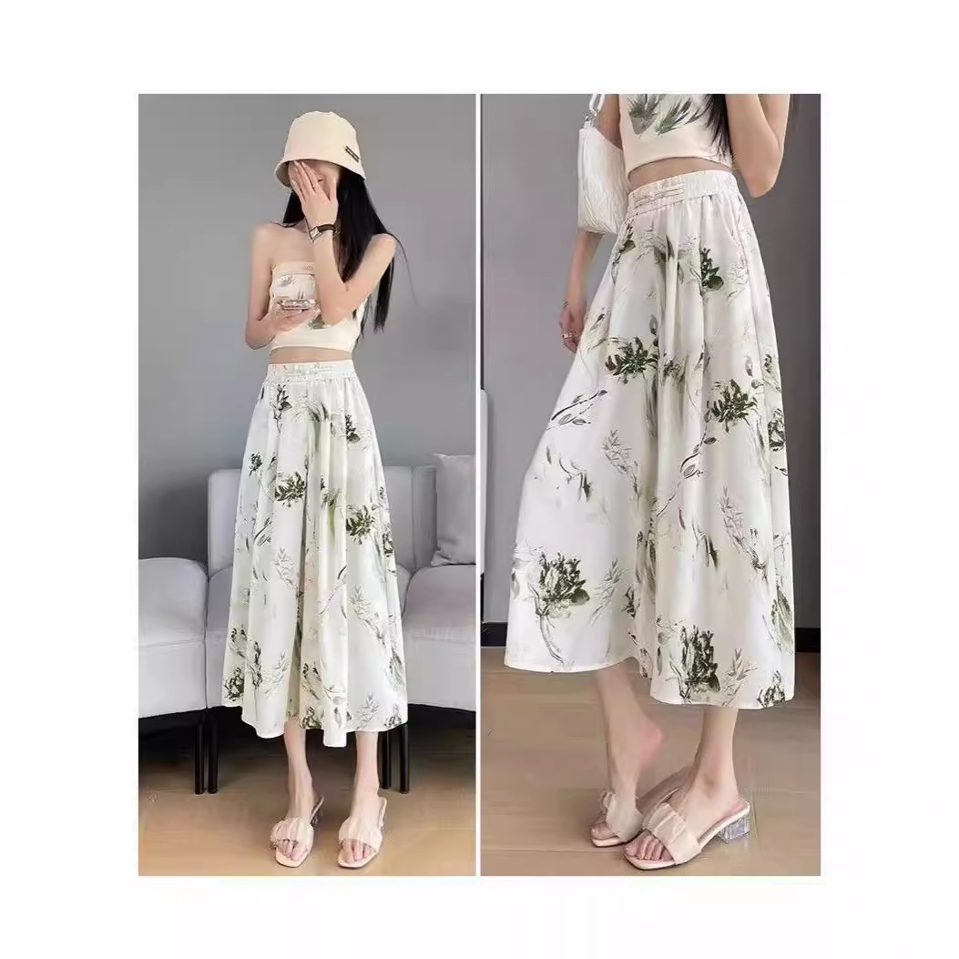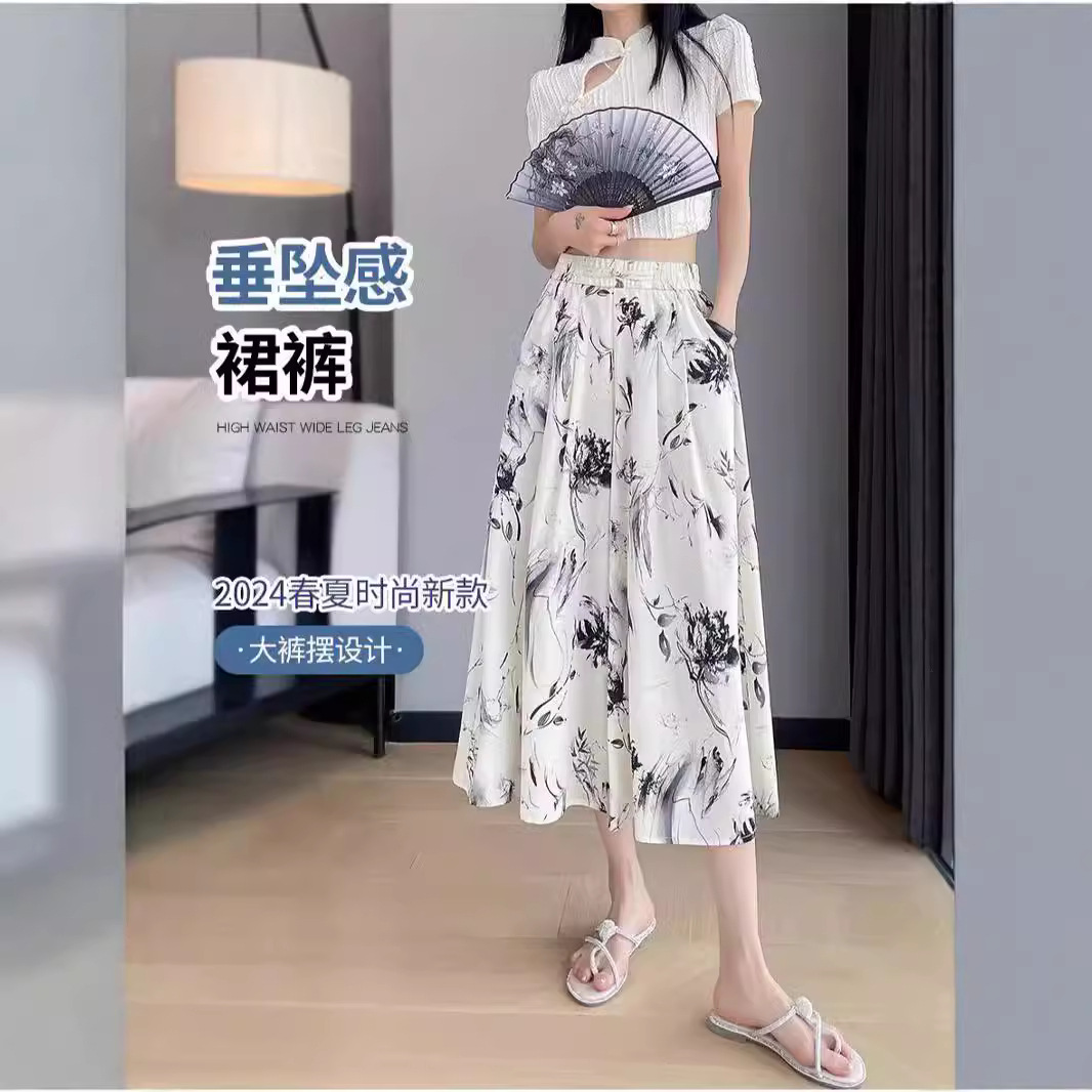 アイススカートの女性の夏の薄いタイプの2024の新型の高い腰の垂れ下がった感の7分の小さい背の水墨画の国風の広い足のズボン